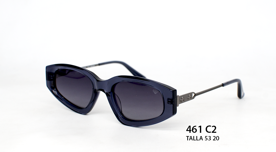 Montura curva inspirada en diseños europeos, con acetato azul oscuro y brazos metálicos. Sus lentes grises degradadas aportan un toque minimalista y urbano. Cómodas, ligeras y con estilo distintivo.